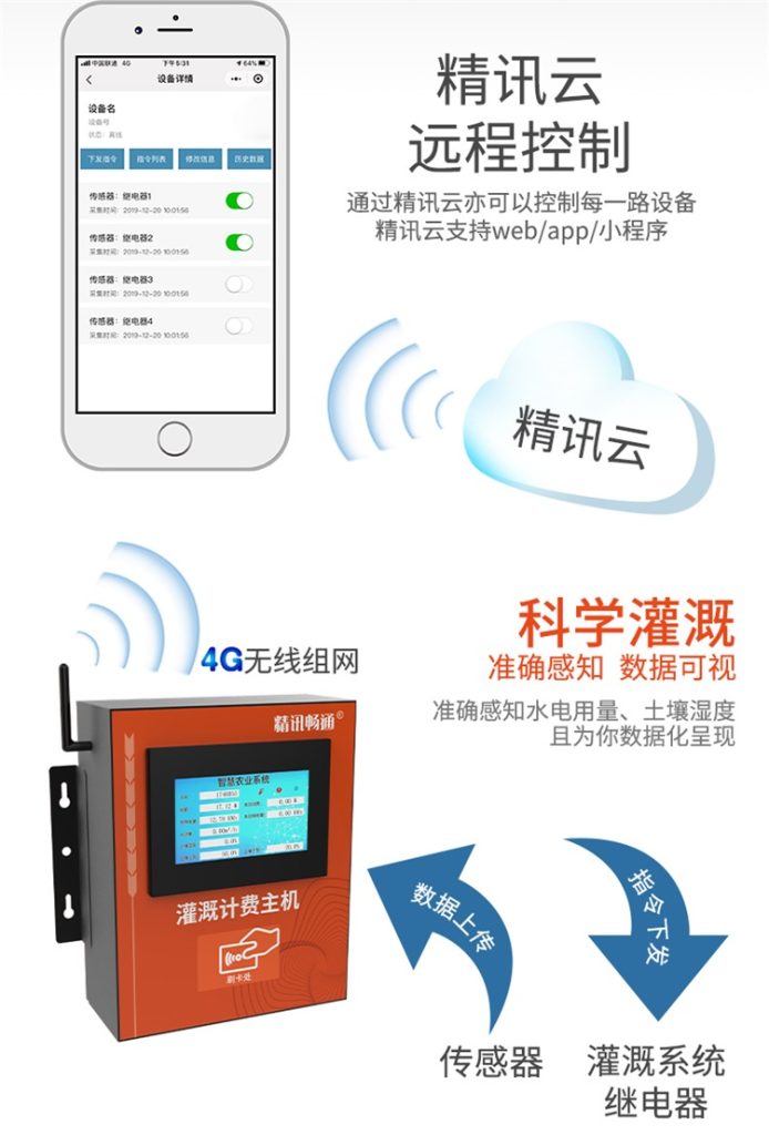 2.数据传输:应用LoRa、WIFI、4G/5G无线传输网络进行传输,设备自带LoRa网络,传输距离远,满足规模化农田灌溉;