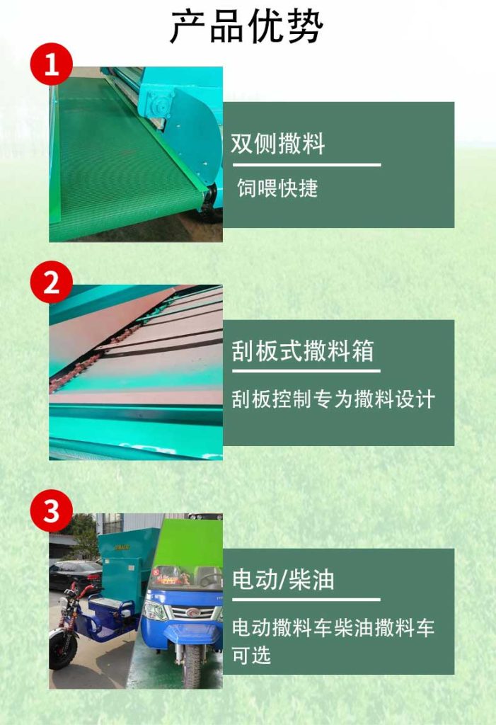 精准控制与均匀撒布技术,通过预设程序或手动调节,撒料车能够沿指定路径行驶,同时均匀地将饲料撒布在养殖区域内。广泛应用于奶牛场、养猪场、养羊场等大型养殖场。