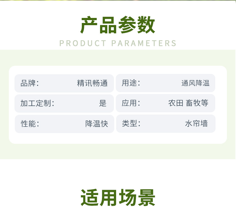 当干燥的热空气通过湿润的湿帘时,水分蒸发吸收空气中的热量,从而降低空气温度并增加湿度。湿帘广泛应用于畜禽养殖场的降温、温室大棚的湿度调节、工业厂房的降温除尘等场景。