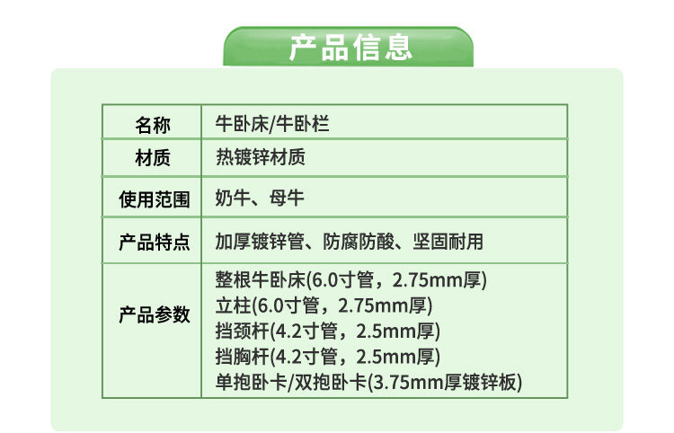 在于,通过合理的空间布局与材质选择,确保奶牛在卧息时能够自然伸展。特别适用于规模化养殖的奶牛场及繁殖母牛养殖场。